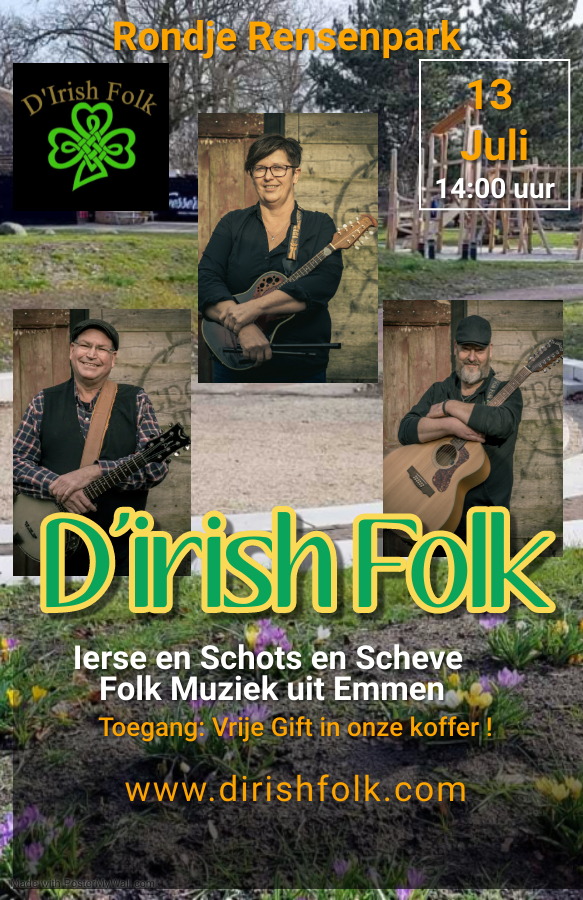 We spelen Ierse, Schotse Folk, maar er is ook nog ruimte voor andere Folk. We repeteren geregeld in Emmen e.o. aan de keukentafel en we willen op diverse locaties blijven optreden. We zijn op zoek naar gezellige 40+ mensen die van een goede grap, eten en drinken houden. Dus niet onder de plak en zo. Gewoon zin hebben om op pad te gaan en misschien zelfs voor een paar dagen. We hoeven niet elke week ergens op te treden, het moet niet op werken gaan lijken. Spreekt je dit aan en speel jij Accordeon, Viool, Whistles, of andere instrumenten en kan je ook nog een beetje zingen, meld je dan aan bij ons.