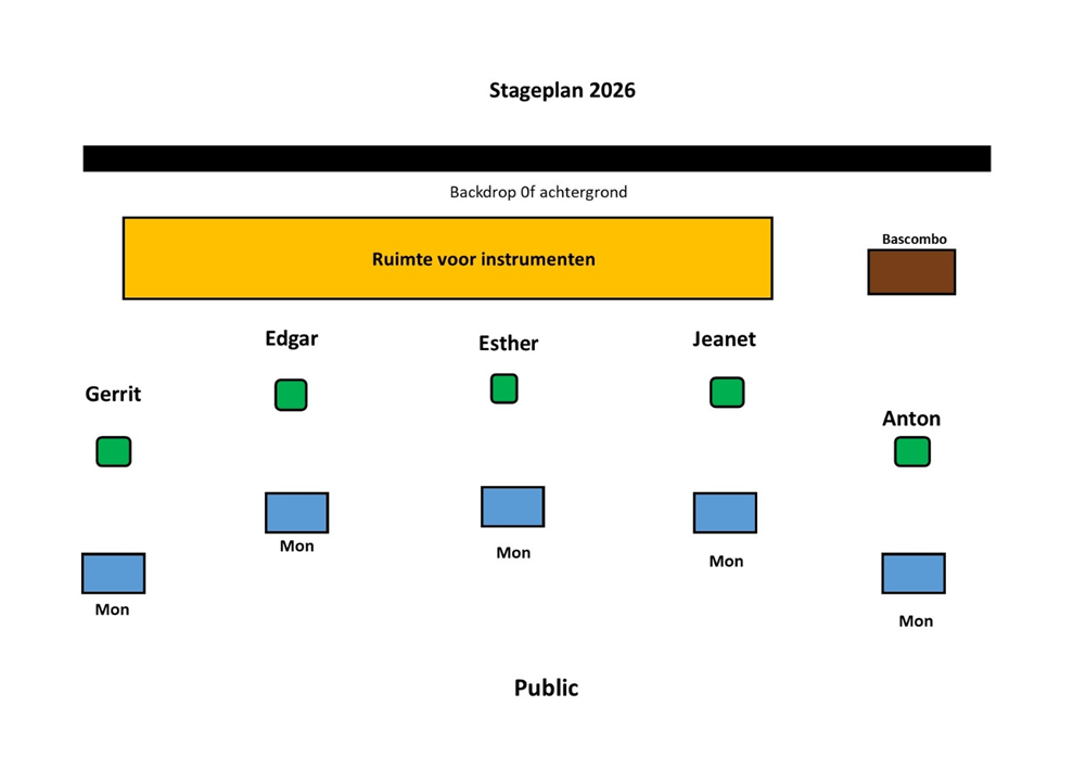 In principe komen wij naar onze optredens met eigen licht en geluid en crew. Maar op sommige locaties is podium, verlichting en geluid aanwezig. Hieronder de priklijst van onze band;